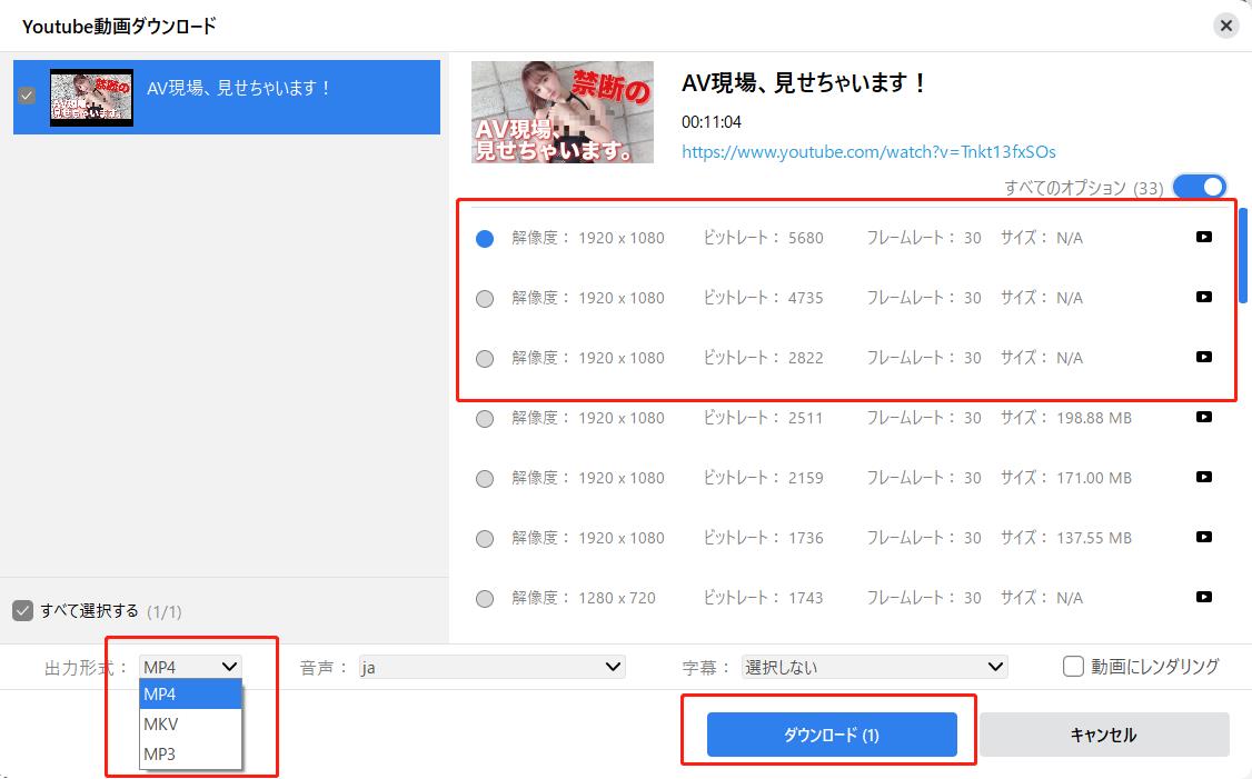 • ダウンロード開始:再生中に表示されるダウンロードリストから、解像度や形式(MP4/MKV)を選択し、「ダウンロード」をクリック。